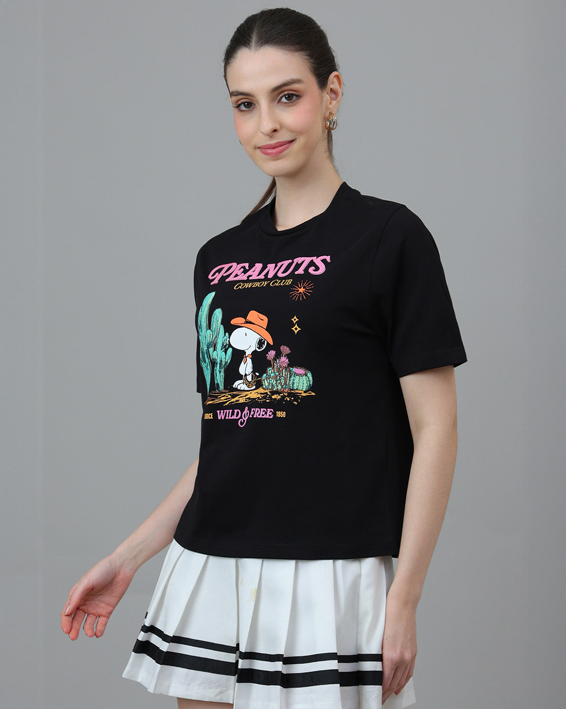 This Peanuts Printed Regular Fit T-shirt delivers classic cartoon charm with everyday comfort. Made from soft fabric, it ensures breathability and ease of movement. The cheerful Peanuts graphic adds playful appeal to casual outfits.