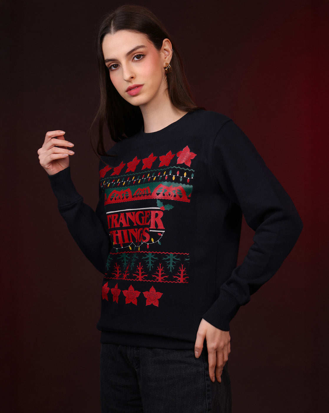 Presenting a total holiday-heist spirit: The Stranger Things Ugly Sweater Edition Sweatshirt for women, officially licensed clothing by Free Authority in India.